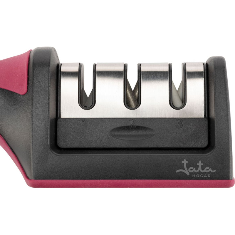 Sharpener for knives with non-slip base and handle to keep your knives sharp and make perfect, smooth cuts   Features 3 sharpening processes: Roughing (Tungsten), sharpening (diamond) and polishing (ceramic) Swipe in one direction, backwards Non-slip handle and base Suitable for knives of all sizes Simple and comfortable handling Effective sharpening Sizes: 6,4 x 21,6 x 5,2 cm