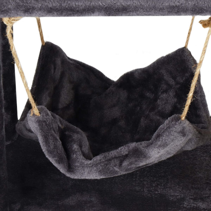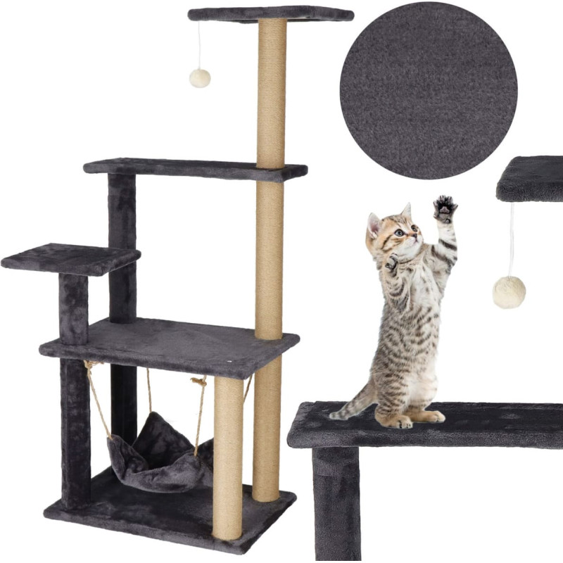 Color: cream/graphite Number of levels: 6 Number of construction tubes: 8 Product for self-assembly according to the attached instructions Dimensions: Total height: 121 cm Base length: 52 cm Base width: 37 cm Hammock: 34 x 34 cm Hammock string length: approx. 30 cm The distance of the hammock from the base is adjustable with strings Platform 1: 52 x 37 cm (length x width) Platform 2: 25 x 25 cm (length x width) Platform 3: 52 x 19 cm (length x width) Platform 4: 30 x 30 cm (length x width) Thickness of base and platform: 1.5 cm Length of elastic cord with pompom: min. 15 cm / max. 28] cm Pom pom thickness: approx. 3.5 cm Length of structural tubes: 19 / 34 / 39 cm Thickness of structural tubes: 6 / 6.5 cm Arrangement: Height up to 1 platform: 43 cm (measured from the base) Height up to 2 platforms: 65 cm Height up to 3 platforms: 84.5 cm Height to 4 platforms: 121 cm Height from 1 platform to 2: 21 cm Height from 1 to 3 platforms: 42 cm Height from 2 to 3 platforms: 21 cm Height from 3 to 4 platforms: 36.5 cm Height from 1 to 4 platforms: 78 cm