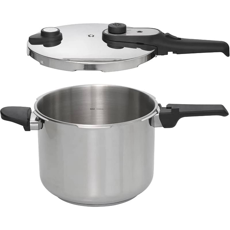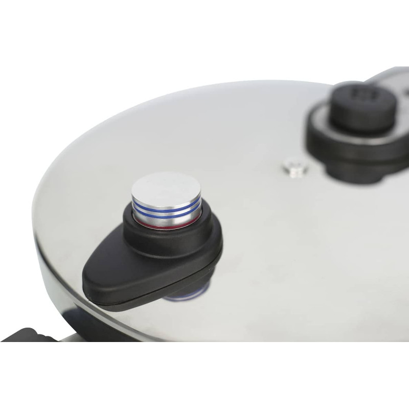 Quick pressure cooker High security. Pressure 100 kPa. Pressure control valve: Position 1: 100 kPa. Safety valve pressure: 130-170 kPa. Safety window pressure: 180-300 kPa. SUS304 stainless steel. Diameter 24 cm. 1.2 mm. thickness housing. 5 mm. sandwich base. Suitable for all cookers, induction included. Volume: - HOLL2226: 6L. Package dimensions (cm): 42.00 x 28.00 x 21.00