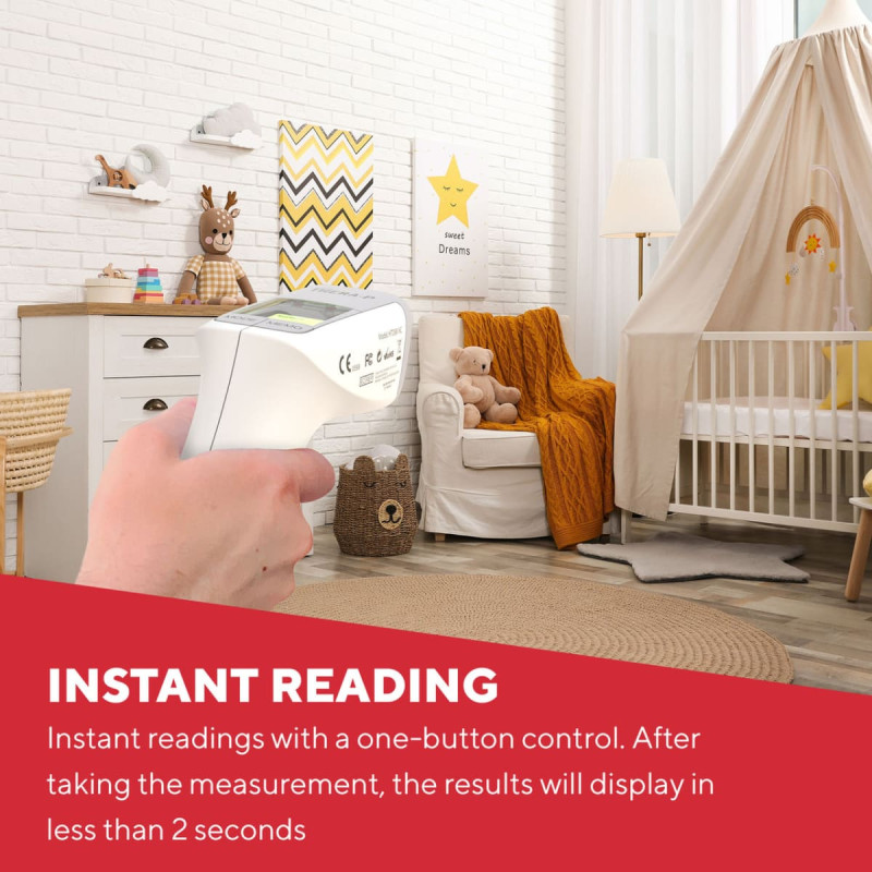 Easy to read icons Color coded results, easily understand your measurements   Non-contact measuring Allows for non-contact measurements to be taken providing a clean and safe way to take multiple measurements   Instant readings Instant readings with a one-button control. After taking the measurement, the results will display in less than 2 seconds   50 memory recall View your temperature history at the touch of a button   Surface mode Check the temperature of foods and liquids such as baby milk. Also great for measuring bath water temperature