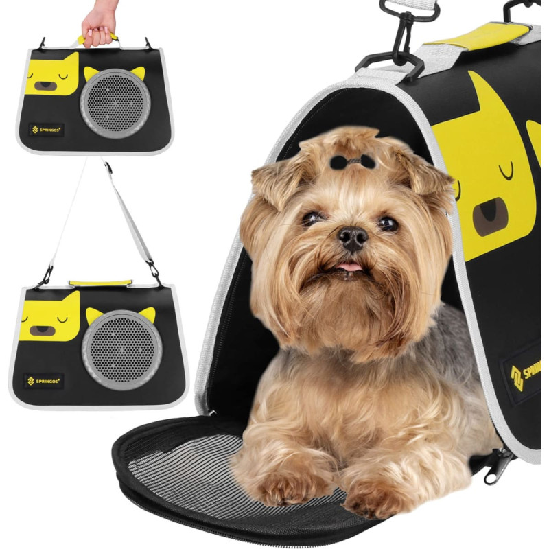 Advantages: ✅ Compact dimensions: The carrier with dimensions 24 x 40 x 24 cm is perfect for transporting small animals weighing up to 10 kg. ✅ Sturdy construction: Made of durable materials to ensure longevity and protection during transport. ✅ Ventilation openings: Provide proper air circulation, which is essential for your pet's comfort. ✅ Stylish design: The black-yellow-grey finish gives the carrier an elegant and modern appearance. Parameters: Brand: Springos® Color: black, yellow, grey Material: polyester, plastic, MDF Maximum load: 10 kg Size: S/M Dimensions: 24 x 40 x 24 cm Hand handle + shoulder strap Foldable: yes Weight: 0.9 kg Dimensions: Total height: 24 cm Total length: 40 cm Total width: 24 cm Floor pad: 30 x 20 cm Shoulder strap length: min 43 cm, max 83 cm; width: 3.5 cm Hand handle: length 15 cm, width 4 cm Ventilation grid diameter: total — 17.5 cm; perforated surface — 14 cm Folded carrier dimensions: 40 x 28 x 7 cm Additional Information: Ventilation mesh panels are located on the side walls, with a round plastic ventilation grid on the front wall. The upper part is slightly reinforced and connects to the side walls and floor with a two-way zipper. The front features a decorative print and a sewn Springos logo. The protective floor pad has a soft, cream-colored lining. Inside, there is a sturdy MDF board that can be removed by unzipping the outer cover for washing. Includes a hand handle and a detachable, adjustable shoulder strap. To fold the carrier, fully unzip the zipper and flatten it. To access the pet, unzip part of the zipper surrounding one of the side walls.
