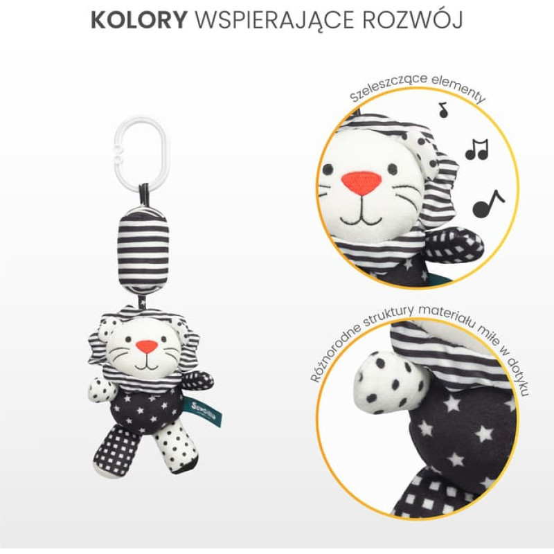 The Black & White plush stroller pendant attracts the child's attention not only with its characteristic black and white color, but also with a bell pleasant to the ear. The mascot has a universal holder that allows it to be attached anywhere, at home or on the go. Additional attractions for the baby are rustling ears and a squeaker hidden in the belly.
