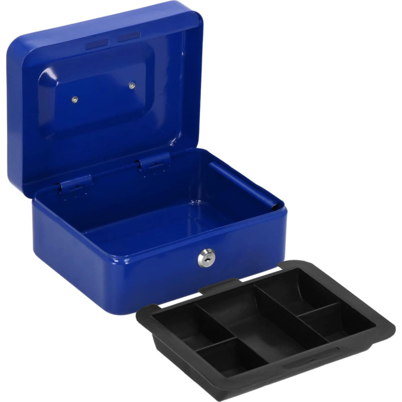 Brand: Springos Color: blue with silver elements Insert color: shade of black Material: metal, plastic Finish: glossy Lock type: key lock Number of keys included: 2 Carrying handle: yes Inner coin tray: yes Number of compartments: 5 Removable tray: yes Cash box dimensions: Width: 20 cm Depth: 16 cm Height: 9 cm Handle dimensions: Width: 8.5 cm Height: 3.5 cm Thickness: 4 mm Side compartment dimensions: 4.5 x 5.5 cm Middle compartment dimensions: 6.5 x 11.5 cm
