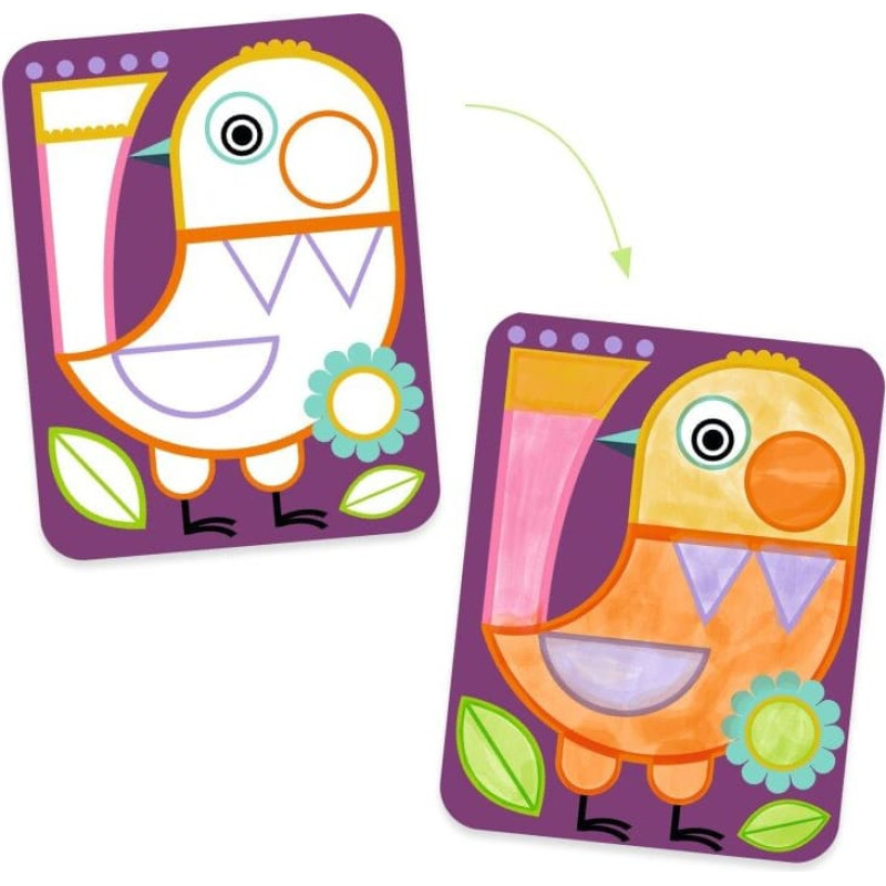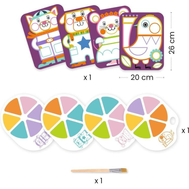 Little artists can discover paint in a fun and age-appropriate way. With palettes printed directly onto the sheets, they can paint ‘like grown-ups’, without the need for cumbersome or messy equipment. Everything has been thought out to provide children with a fun and practical activity that will build their confidence! Set includes 4 scenes to paint (20 x 26 cm), 4 printed ink palettes, 1 paintbrush with wooden handle and an illustrated set of instructions. A ready-to-use activity with no additional material or mess. Large areas to paint – suitable for little one’s skills, for a lovely result every time. A special cut-out area on the palette-sheet holds the paint, for painting like a real artist. Even after they’ve finished the child can repeat the activity again and again, changing the colours and patterns as much as they like! Suitable from 3 to 6 years. Warning! Not suitable for children under three years, choking hazard due to small parts.