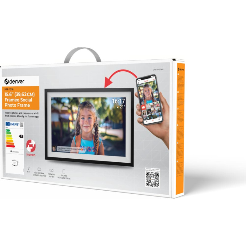 Stunning Display & Ample Storage Showcase memories on a 15.6” Full HD IPS touchscreen with 1920x1080 resolution and 16GB storage for thousands of photos.   Seamless Sharing Use the FRAMEO app to send photos and videos directly from your smartphone to the photoframe—perfect for family sharing.   Photo-Based Social Connection Receive pictures and videos from friends, add text for a personal touch, and enjoy a new way of sharing moments.   Total Control Manage friends, set photo rotation (10 sec – 30 min), and customize your display with ease.   Smart & Convenient The auto-off timer ensures the frame turns off at night for energy efficiency.