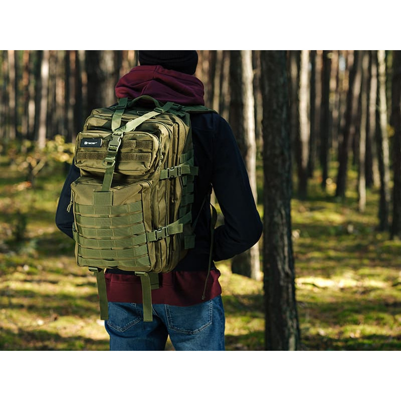 Waterproof 1000D polyester Capacity: 40L Size: 50 x 25 x 28 cm 2 large main compartments Ventilated shoulder straps and back Compression straps Molle strapping system Adjustable hip and chest belts 15.6" laptop compartment D-rings Adjustable shoulder straps Hydration bladder pocket Velcro panel for patches and emblems