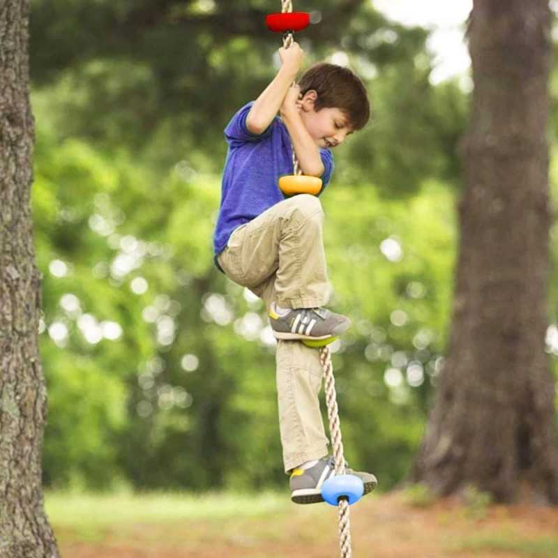 Parameters: Brand: Springos® Number of steps: 5 Rope color: brown Color of platforms: multi-colored (orange, green, yellow, blue, red) Metal fastening ring at the top of the rope For children from 3 years of age Anti-slip construction on platforms Maximum load: 150 kg Dimensions: Rope length: about 200 cm Distance between steps: 35 cm Step diameter: approx. 10 cm Rope length: about 200 cm Rope thickness: 2.3 cm Mounting ring diameter: 4.1 cm Mounting ring thickness: 7.5 mm Distance from the top of the rope to the fastening ring: 2 cm *Size tolerance +/- 5%