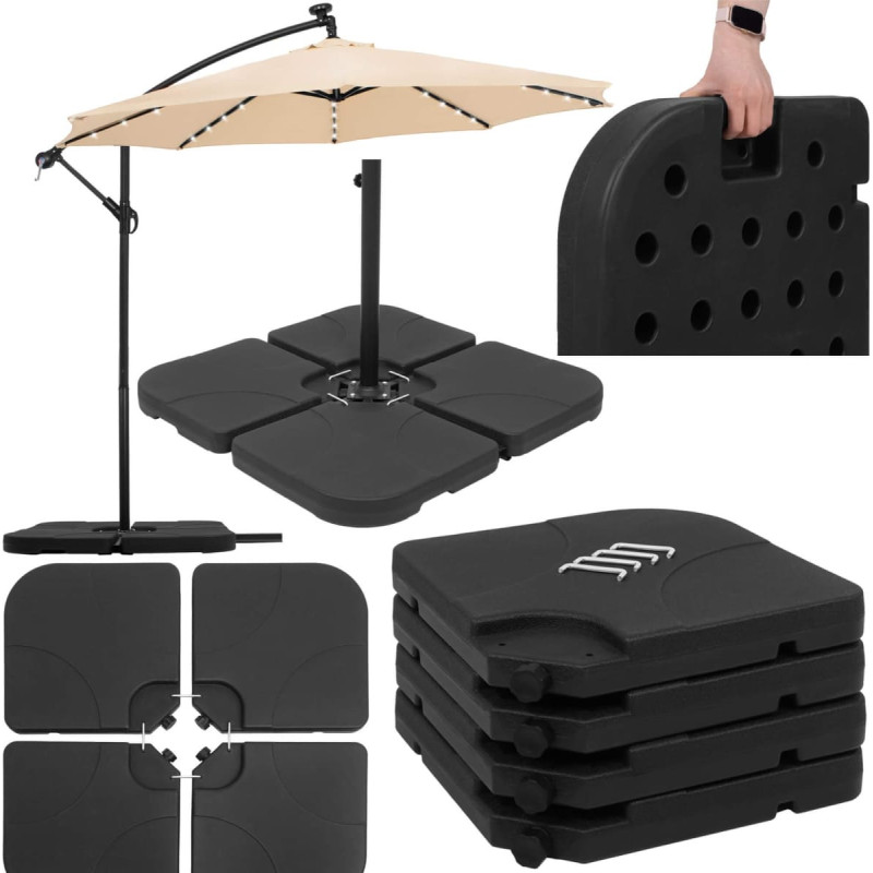 Black colour Material: plastic Capacity: 60 L Garden umbrella weight - set of 4 elements Element dimensions: 50 x 50 x 7 cm The set includes: 4x metal anchors to connect the elements Single element dimensions: Width and length: 50 x 50 cm Height: 7 cm Filler hole diameter: 25 mm Anchor dimensions: 9 x 3 cm, diameter: approx. 8 mm Distance between elements fastened with anchor: 3 cm Total dimensions of the entire base (4 elements connected with anchors): 103 x 103 cm Additional information: Handle: yes Can be filled with water or sand The anchors connecting the elements are placed in special holes Note: In case of frost, remove water from the product to prevent damage
