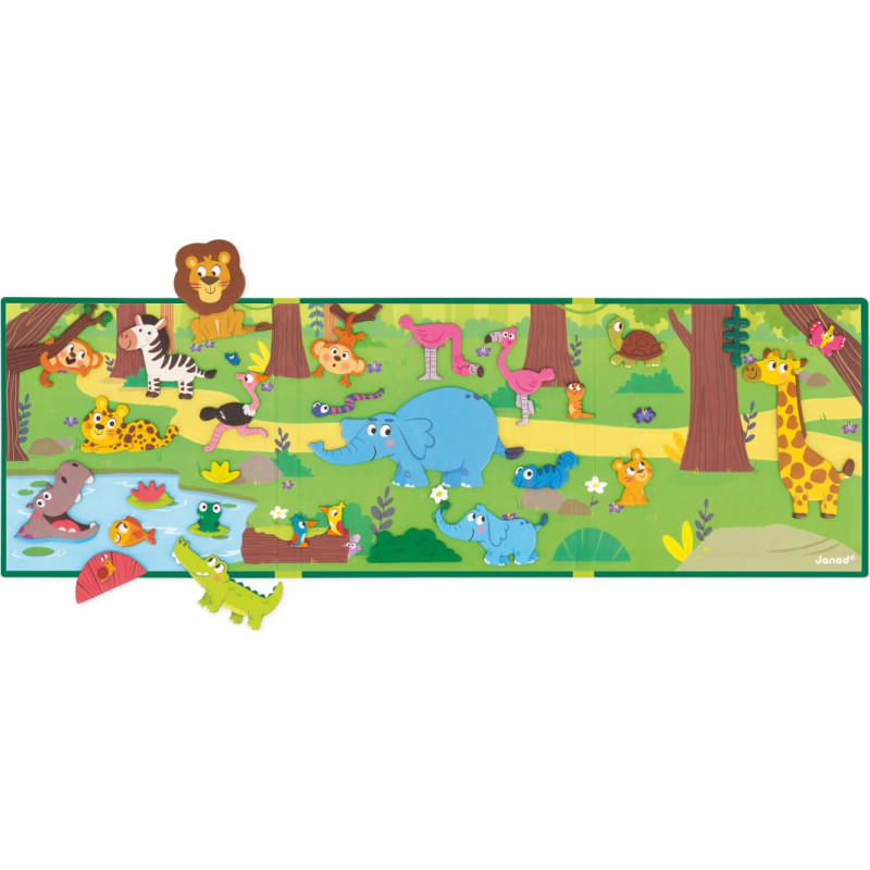 It’s time to discover African animals! A lion, elephant, monkey, meerkat and even a piranha are all patiently awaiting whatever new adventures your child will think of next. This book contains everything little ones will need to invent countless stories: a large magnetic backdrop and 30 magnets depicting animals or decorative elements. Magnetic toy made from FSCTM cardboard. Toy for children aged 3 and up.