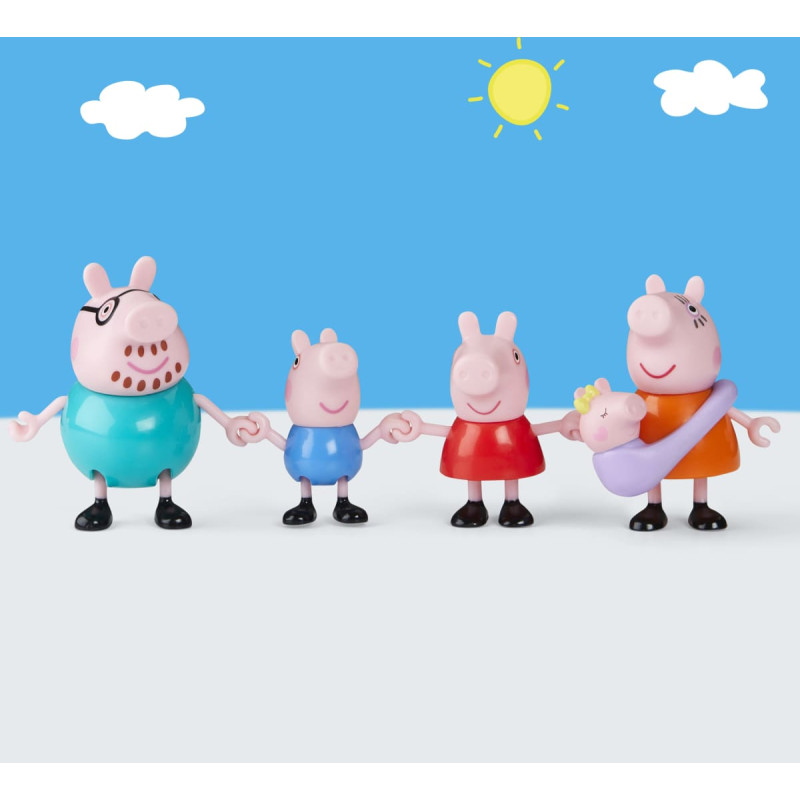 The Pig Family is now a family of five! This Peppa Pig toy set comes with Daddy Pig, Mummy Pig, George, Peppa, and Baby Evie in her carrier. Little ones can put the carrier on Mummy or Daddy Pig and recreate favorite scenes from the show or tell new stories of their own. The poseable figures can even hold hands for sweet family moments. Toys like the Peppa´s Family of Five figure set make great gifts for 3 year old girls and boys and up. Figure scale: 7.5 cm.