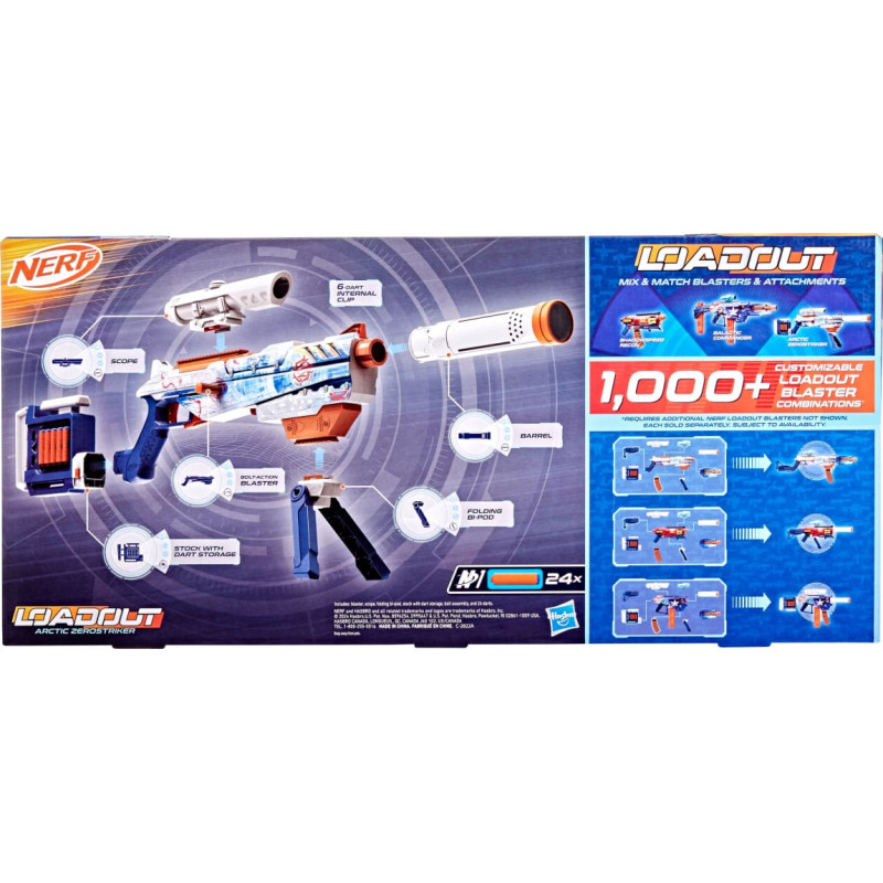 Bring video games to life and customize your ultimate blaster! Nerf Loadout dart blasters include interchangeable attachments to mix and match for endless combinations! The Nerf Loadout Arctic Zerostriker bolt-action blaster has a 6-dart internal clip and comes with scope, stock, barrel, and bipod attachments. It features the legendary Arctic Zerostriker skin geared for epic battles in subzero environments. The bolt can attach on either side for right-handed or left-handed players. The Nerf Loadout Arctic Zerostriker blaster includes 24 Nerf N1 darts designed for extreme accuracy, speed, and distance. Build your Nerf Loadout blaster stockpile for endless customizable options (each sold separately, subject to availability). Nerf N1 darts are compatible only with Nerf N1 dart blasters. Eyewear recommended (not included).