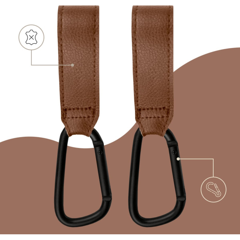 SIPO stroller hooks are practical accessories that make it easy to carry bags, shopping, or a baby organizer. The sturdy construction features a matte-finished metal carabiner and PU leather strap, ensuring durability and stability even with daily use. Their universal design and elegant look make them compatible with all types of baby strollers – both prams and pushchairs.