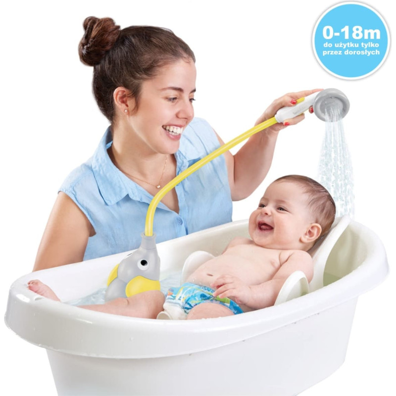 How to Use? Place the Elephant Baby Shower in the tub, ensuring the water level is at least 10 cm (4 inches). Press the buttons located on the sides of the shower sprayer to activate the water flow. If the flow stops, release the buttons and gently shake the elephant in the water. Start by directing the gentle stream onto the baby’s feet to help them get used to the water. Once they feel comfortable, continue with the rest of the bath. Product Features: Portable elephant shower with an easy-to-maneuver sprayer. Very simple to operate, even for small children. Ergonomically designed to fit small hands. Battery-powered pumping system encourages independent play and helps overcome fear of water. Features an on/off switch for controlling water flow, reducing anxiety and promoting hand-eye coordination. Replaces a traditional shower during bath time, and since the water is pumped directly from the tub, parents can ensure it’s always at the ideal temperature. Grows with your child – later serves as a fun bath toy. Usage Instructions: Dry thoroughly after each use. Do not leave in water when not in use. Recommended Age: 0–24 months Batteries Required: 4 “AA” (not included)