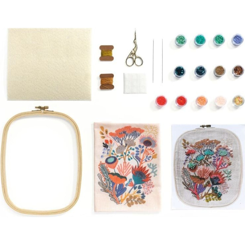 Learn a skill inspired by haute couture: beadwork. Atelier 58 offers an introduction to this art form. Beadwork involves carefully embroidering beads and sequins onto taut canvas fabric. Using a needle, each bead is placed with precision, following the design printed onto the fabric. A calm activity to enjoy at your own pace, at home, for a truly relaxing experience. Set includes 1 wooden embroidery hoop, 1 piece of printed canvas fabric, 1 pair of embroidery scissors, 13 boxes of beads and sequins, 1 bead mat, 3 needles, 1 threader, 2 spools of gold thread, 1 template to follow, leaflet and a card with a QR code leading to a video tutorial. A comprehensive kit, including all the necessary materials. Wooden hoop included, to frame and proudly display your creation. Made of FSC® certified paper and cardboard. Suitable from 15 years and adults. Warning! This item is not a toy! Keep out of reach of children!