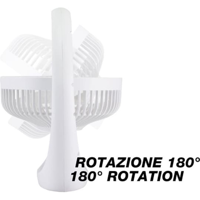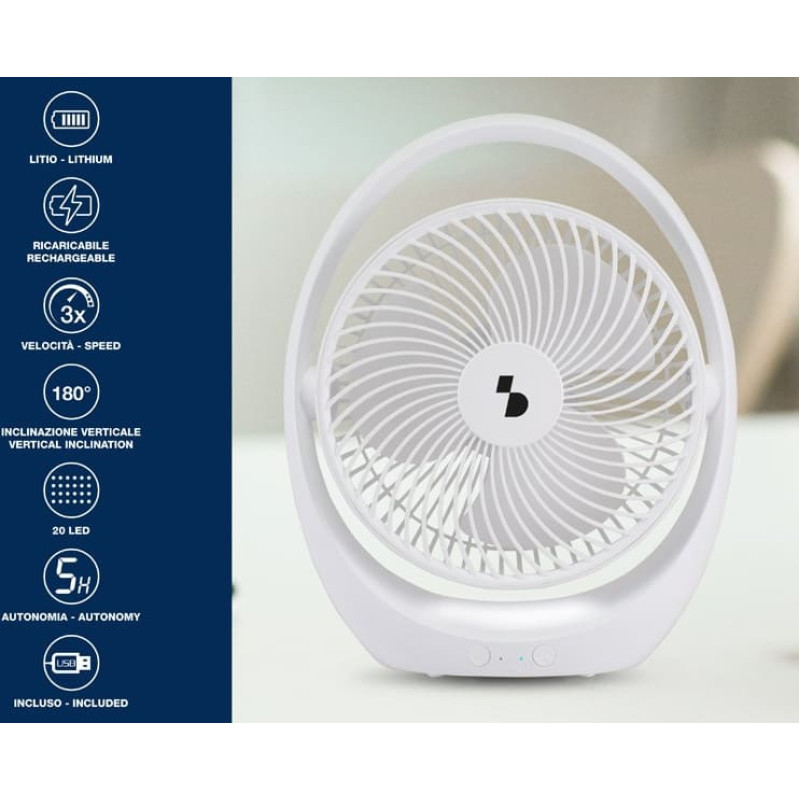 Rechargeable Portable Fan with LED Light With LED night light function with 2 luminous intensities. 3 ventilation speeds and adjustable vertical inclination. Comfortable handle for taking it everywhere and non-slip feet 2400mAh lithium battery with approx. 5 hours autonomy and approx. 3.5 hours charging time. Low battery indicator and USB charging cable included.
