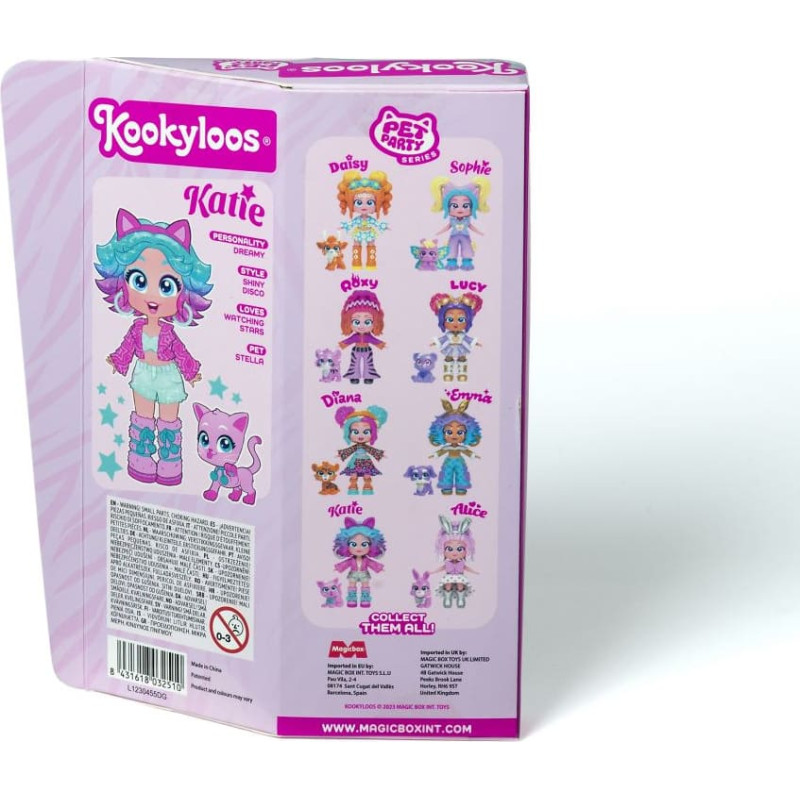 Pet Party KatieCollectible Katie doll with a pet. She has her own fashion clothes and accessories, and three different faces! Contains: 1 Kookyloos doll.1 pet.Fashion clothes and shoes.1 accessory.