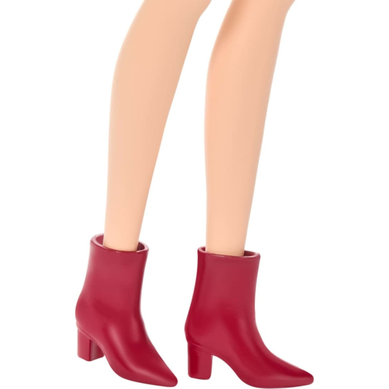 This Barbie doll has a fuller body type and wears her black hair down. Her look is accented by a berry-colored bow choker and matching boots. She stuns in a strapless pink dress featuring a heart-shaped neckline, flared skirt, and a shiny leopard print design. With her versatile and trendy look, she’s ready for anything – from a birthday party to a glamorous city outing. The doll is made from 50% ISCC-certified plastic (mass balance approach), excluding head, hair, and clothing. Suitable for children aged 3 and up Each item sold separately Some items may not be available in all countries Doll cannot stand alone Colors and decorations may vary