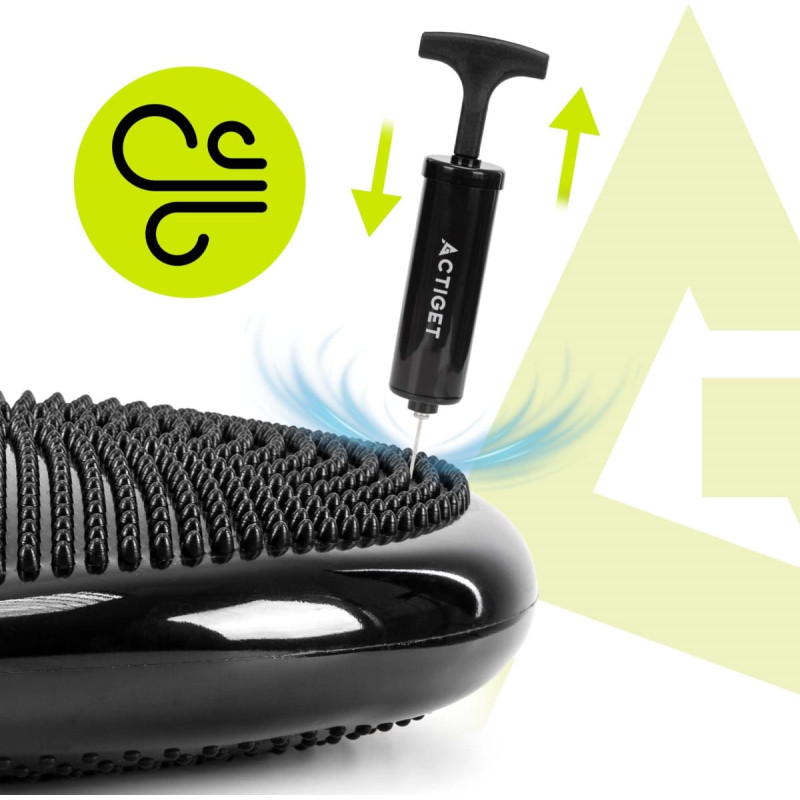 Brand: Actiget® Universal series Material: PVC Color: blue Weight: 870 g Maximum load: 210 kg The set includes: 1 x sensory cushion 1 x pump 1 x needle Dimensions: Diameter: 34 cm Height: 7.5 cm Additional information: The product features the Actiget® logo The cushion has 2 types of surfaces: one smooth with small bumps and the other – massaging and stimulating with long protrusions