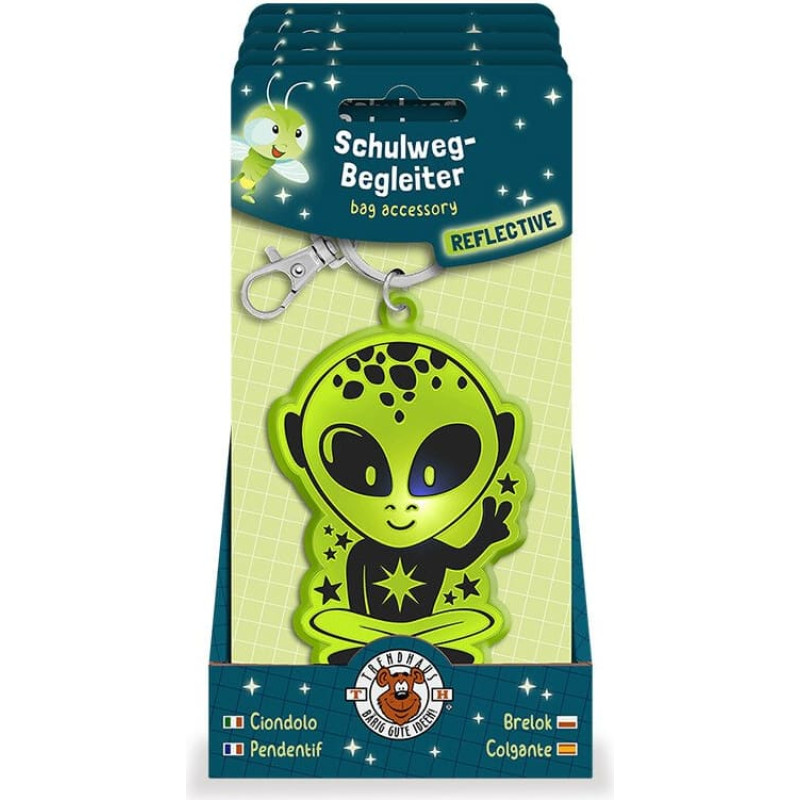With this reflective pendant with key ring, schoolchildren and nursery school children are always clearly visible when out and about! Easy to attach to a rucksack or clothing using the carabiner clip. Size: approx. 9 cm. Available in 6 different designs: mermaid, dinosaur, alien, unicorn, dragon, football. Made in China.