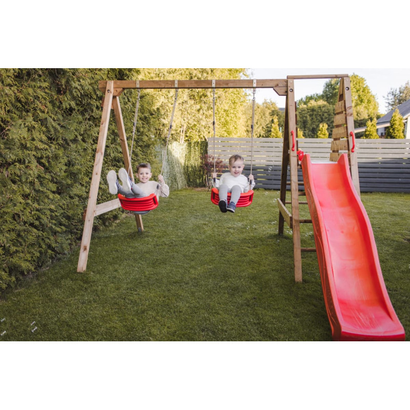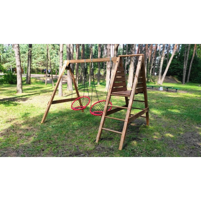 Bērnu rotaļu laukums EGLE - aktīviem un neaizmirstamiem bērnu brīvā laika mirkļiem svaigā gaisā. Aktīva atpūta svaigā gaisā būs noderīga, patīkama un smaidiem bagāta. Komplektā neietilpst slidkalniņš, iesakām iegādāties papildus 220 cm garu slidkalniņu. Komplektā ietilpst: • Koka rāmis (augšējā sija: 9 x 9 cm, kājas: 7 x 7 cm) • Divas šūpoles ar virvēm un karabīnēm • Platforma slidkalniņam • Instrukcijas un stiprinājuma elementi UZMANĪBU!  Rotaļlaukums ir izgatavots no dabiska, neapstrādāta koka un paredzēts izmantošanai ārpus telpām. Šī tipa koksnei ir raksturīgs nelīdzenums un reizēm arī plaisas, zaru mezgli vai neliels raupjums, ko var viegli novērst, nopulējot ar smilšpapīru. Rotaļlaukumiem izmantotie kokmateriāli ir saņemti no sertificētiem piegādātājiem, un tiem ir FSC sertifikācija. Rotaļlaukums ir izgatavots no koksnes, kas impregnēta, izmantojot īpašu tehnoloģiju!  Neraizējieties, ja piegādātā koksne šķiet ārkārtīgi mitra, tumšāka vai pat zaļganīga, jo tās ir koksnes piesūcināšanas sekas. Lai nodrošinātu koksnes ilgmūžību un izturīgumu pret visiem āra apstākļiem, mēs visas koka daļas piesūcinām īpašās augstspiediena kamerās. Izmantojot šo tehnoloģiju, piesūcinoša viela (kuras sastāvā nav hroma) tiek izsmidzināta ar 7 atmosfēras lielu spiedienu un koksne vairākas stundas mirkst piesūcināšanai izmantotajā vielā, tādēļ šī viela atrodas ne tikai uz koksnes virsmas kā gandrīz visu citu ražotāju izstrādājumiem. ŅEMIET VĒRĀ!  Rotaļlaukumi tiek piegādāti nesalikti un nekrāsoti. Ja plānojat uzstādīt rotaļlaukumu zālājā vai uz zemes, mēs iesakām iegādāties īpašus papildu enkurstiprinājumus, ko ievietot zemē un pie kuriem piestiprināt rotaļlaukuma kājas. Metāla enkuru izmantošana nodrošinās rotaļlaukuma stabilitāti. Mēs iesakām šim rotaļlaukumam izmantot  6 šos metāla enkurstiprinājumus.